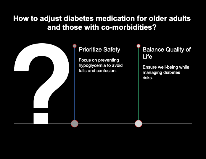For older adults and people who have more than one health problem, the way doctors adjust medicines can be different. The main goal changes to keeping them safe and helping them live well, instead of focusing only on tight glycemic control. Trying to treat strongly in these people can raise the risk of hypoglycemia. This can cause falls, confusion, and other serious troubles, so doctors work to balance the risk of hypoglycemia with the person’s quality of life.