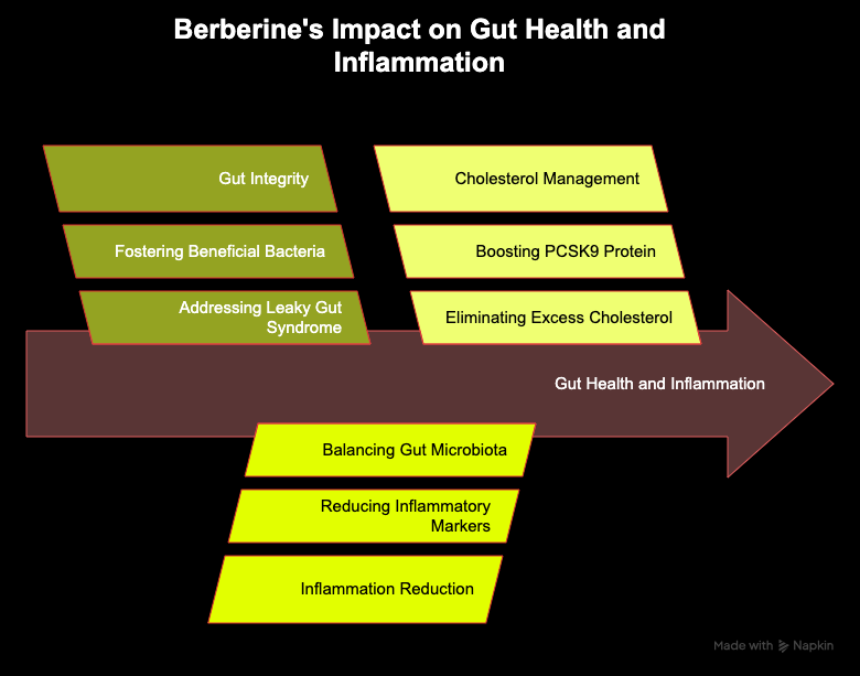 Research shows that berberine can boost gut health. It addresses leaky gut syndrome and encourages good bacteria, which lowers inflammation. Berberine also helps control cholesterol levels. It can raise PCSK9 protein, which helps get rid of extra cholesterol in the body.
