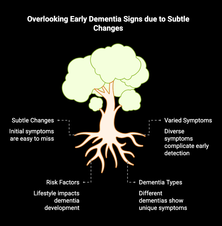 • Early signs of dementia often appear as subtle changes in memory, thinking, and personality, making them easy to overlook at first.