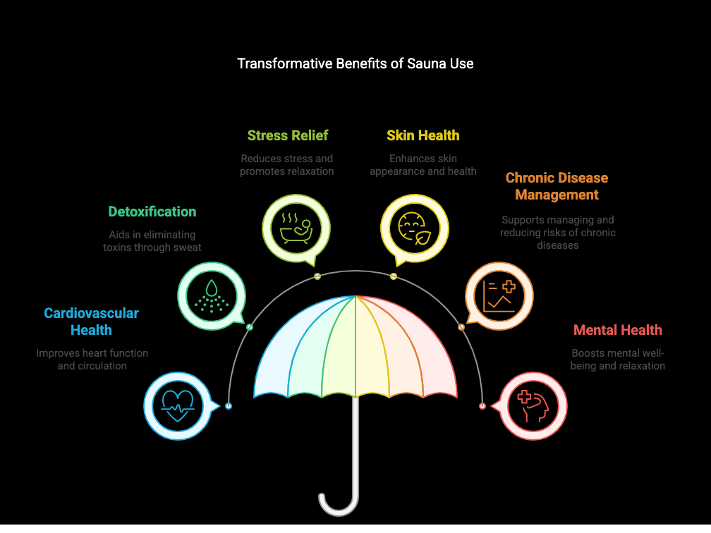 - Regular sauna use leverages heat exposure to provide multifaceted health benefits, including improved cardiovascular health, detoxification, and stress relief.