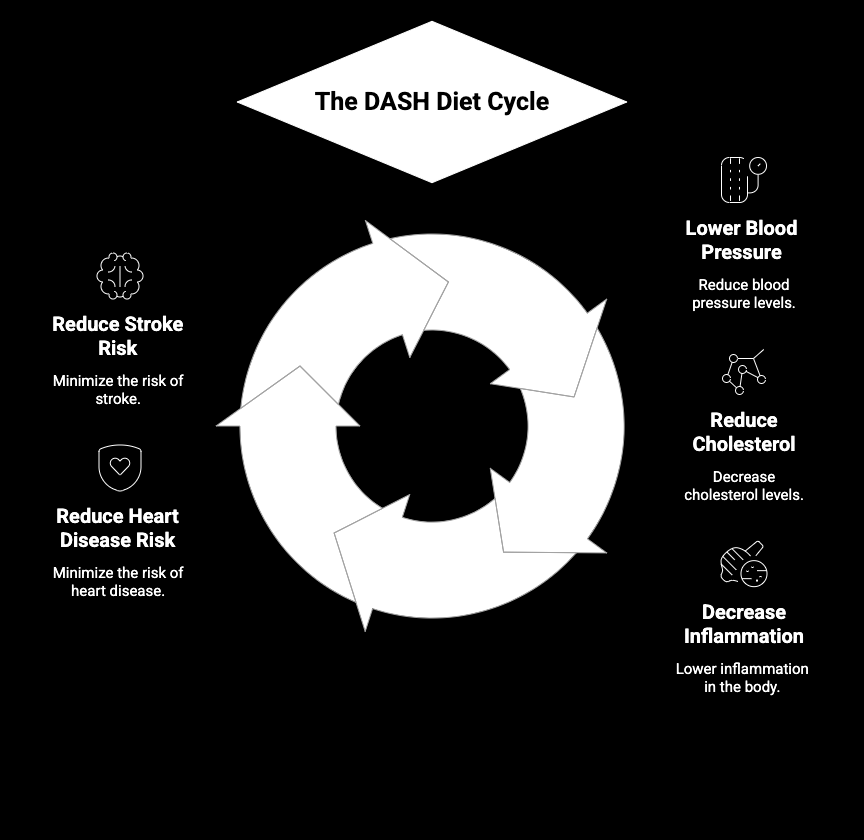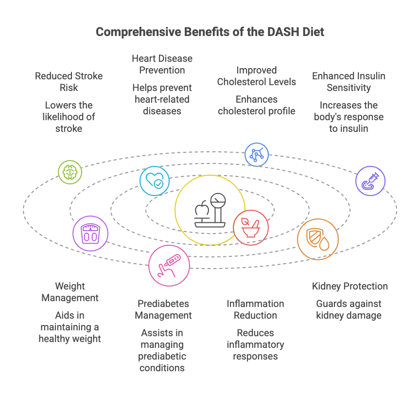 Many follow-up studies on the DASH diet show it can help lower the risk of stroke and heart disease. It can also make cholesterol levels better, improve insulin sensitivity, and lower body weight. The DASH diet is not just for people with hypertension. It also helps control prediabetes, lowers inflammation, and helps protect the kidneys from harm. Because of these good results, big health groups recommend the DASH diet.