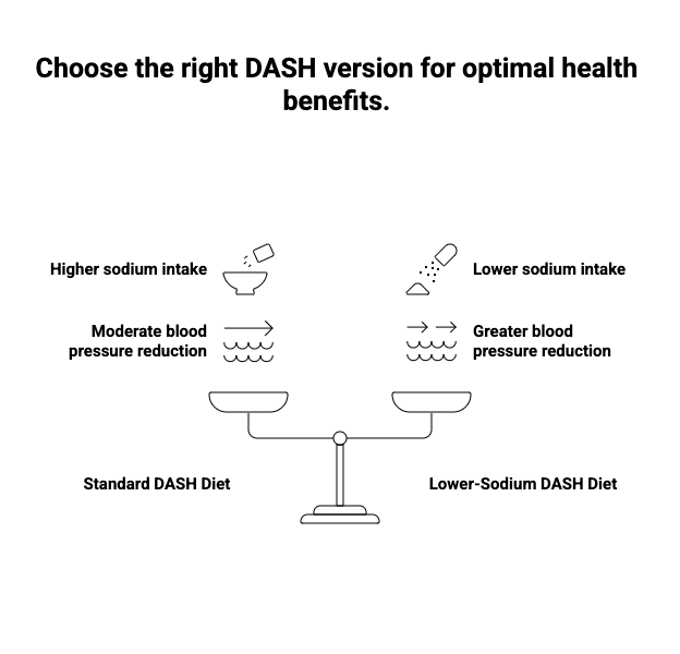 The DASH diet comes in two options. The first lets people have 2,300 milligrams of sodium each day. This is about the same as one teaspoon of salt. The second choice lets people have only 1,500 milligrams of sodium a day. This lower amount can help bring down blood pressure even more. A study called the DASH-Sodium Trial found that people who ate less than 1,500 milligrams of sodium with the DASH diet saw big improvements in their blood pressure.