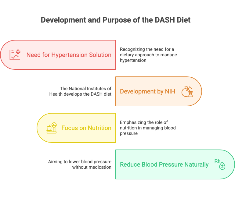 The DASH diet, which means Dietary Approaches to Stop Hypertension, was made to help lower high blood pressure through food. Experts at the National Institutes of Health created this diet in the 1990s. The DASH diet is not just a trend, it comes from a lot of research. The main goal is to lower blood pressure in a natural way, so people do not need medicine right away. This is a simple way to help with hypertension by changing your diet.