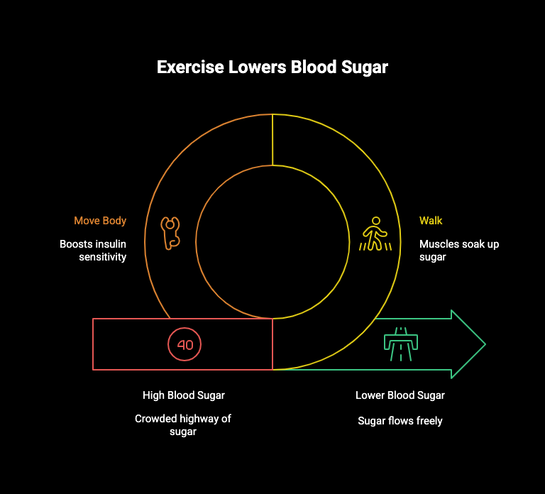 Imagine your bloodstream as a crowded highway. Exercise is like opening up extra exits, allowing traffic (sugar) to flow freely and preventing dangerous jams. Even a short walk can help your body process sugar more efficiently, making a real difference in your health.