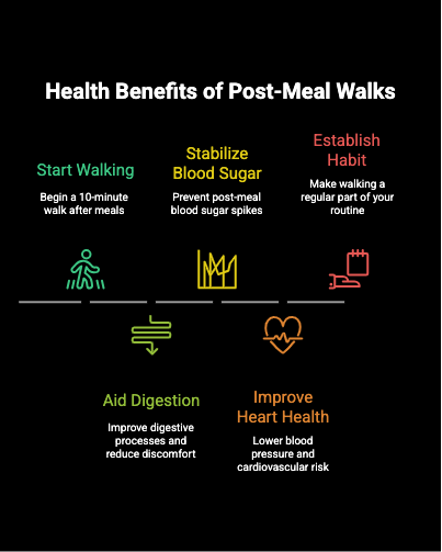 • Regular post-meal strolls contribute to better heart health by helping to lower blood pressure and cardiovascular risk.